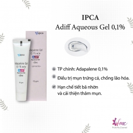 Chứa thành phần là “kẻ thù” của mụn! - Kem điều trị Adiff Aqueous Gel 15g IPCA xứng đáng điểm mười! Thành phần chính - Adapalene 0,1%: loại bỏ mụn trứng cá và mụn ẩn , kháng viêm, kháng khuẩn, hạn chế vi khuẩn gây mụn Công dụng và ưu điểm - Điều trị mụn trứng cá - Hạn chế tình trạng tiết bã nhờn - Giúp chống lão..